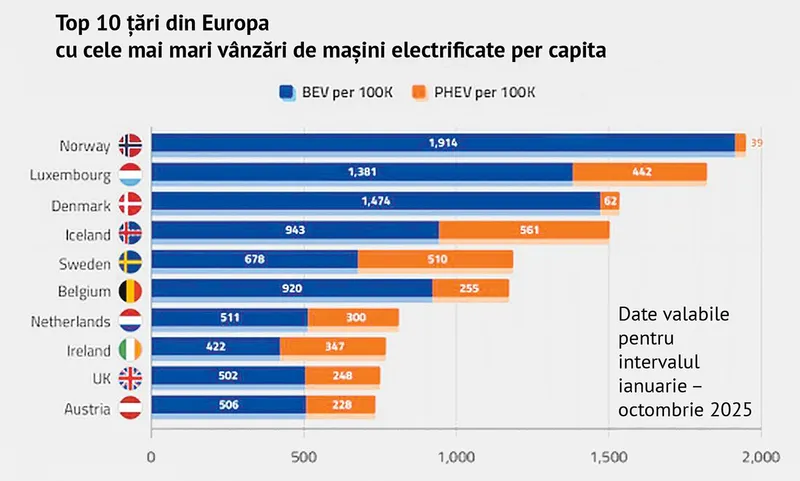 Nu întâmplător BEV-urile domină piețele din unele dintre cele mai bogate țări din Europa, precum Norvegia, Luxemburg, Danemarca, Elveția și Belgia. Veniturile sunt ridicate, schemele de stimulare sunt bine finanțate și rețelele de încărcare dezvoltate.
