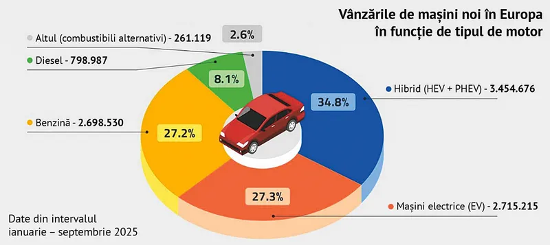 Concret, hibridele (HEV + PHEV) dețin acum cea mai mare cotă de piață, de 34,8% din totalul înmatriculărilor de autoturisme noi, comparativ cu un total cumulat de 35,2% pentru vehiculele pe benzină și motorină (datele valabile pentru intervalul ianuarie – septembrie 2025).