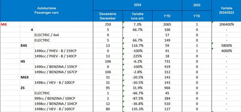 Cea mai de succes marcă chinezească în România, în 2024, a fost, de departe, MG, fostul brand britanic cu o istorie bogată. În primul an plin pe piață, a reușit să vândă 2.065 unități: 211 electrice, 59 plug-in hybrid (PHEV), 1.525 pe benzină și 270 hybrid (HEV).