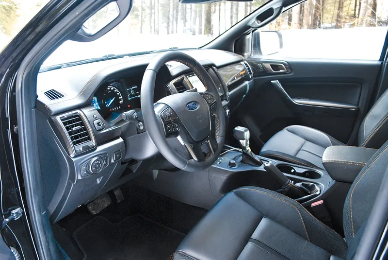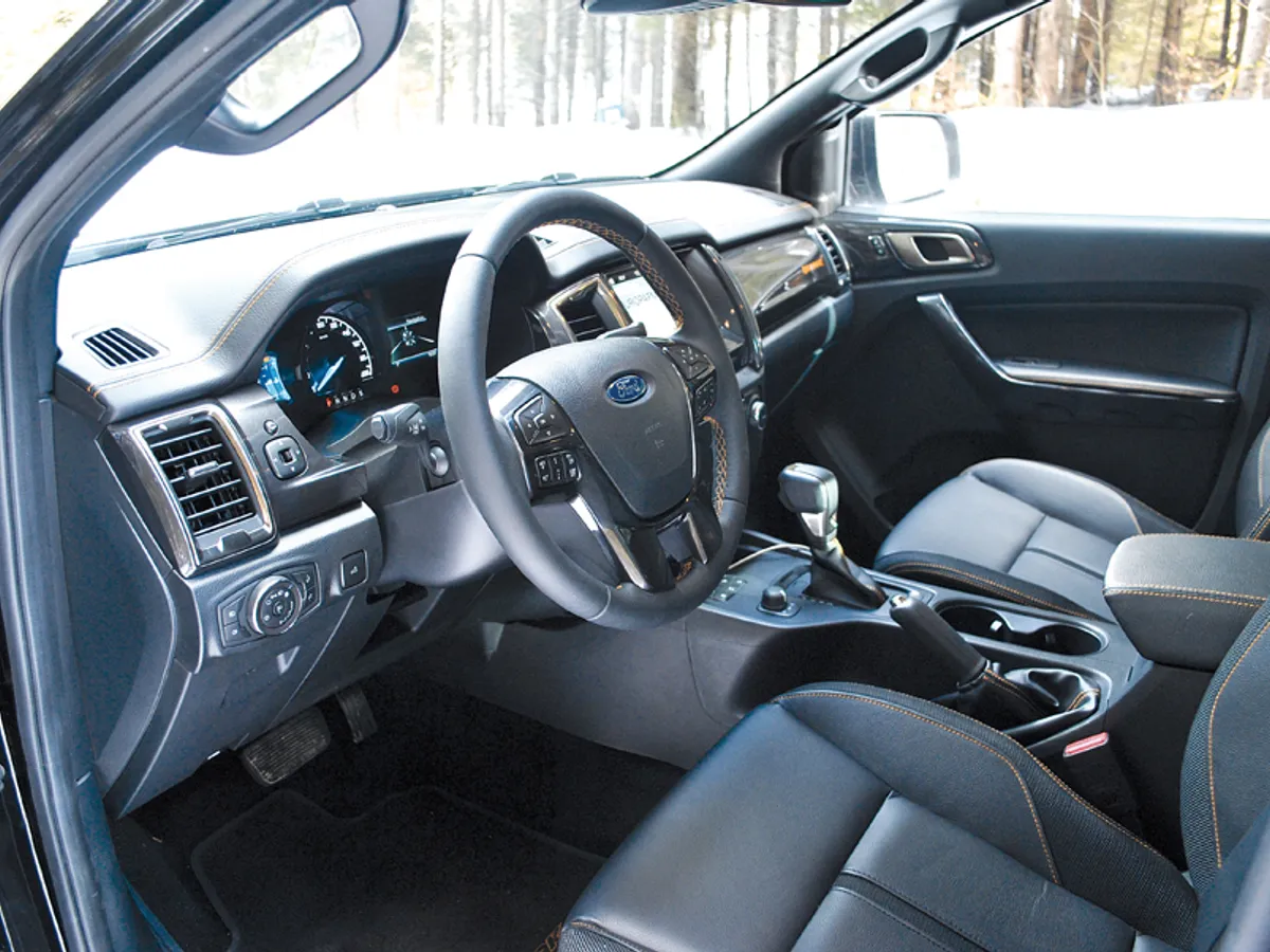 Wildtrak-ul are bordul îmbrăcat în piele, cu cusături vizibile și în contrast, materiale plăcute la atingere cel puțin în zonele superioare vizibile, elemente cromate satinate de culoare închisă, inserții glossy, scaune tapițate parțial cu piele, care integrează elementele grafice Wildtrak, și o planșă de bord simplă și dominată de ecranul tactil generos al sistemului multimedia Sync 3, care este compatibil Apple CarPlay și Android Auto (face mirroring perfect cu Waze) și poate fi operat și prin gesturi, precum „swipe“ sau „pinch“.