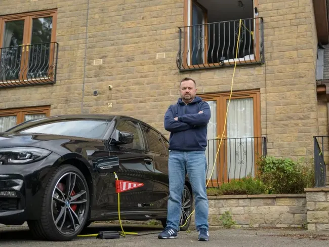 Proprietarul unei mașini electrice care locuiește la etajul unui imobil și nu a putut să-și monteze o stație de încărcare, a găsit o metodă mai mult decât „neconvențională” pentru a-și face plinul de curent acasă.