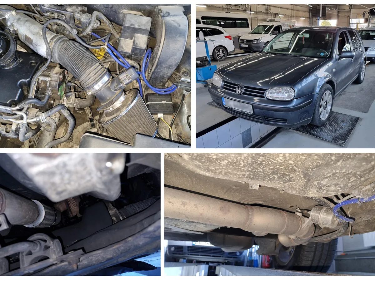 Sub capota autoturismului marca Volkswagen Golf 4, inginerii RAR Bacău au găsit un sistem ilegal de tip exhaust cut-off. Sistemul, care poate costa de la câteva sute până la câteva mii de lei, face ca evacuarea gazelor şi a sunetului să se facă înainte de toba finală.