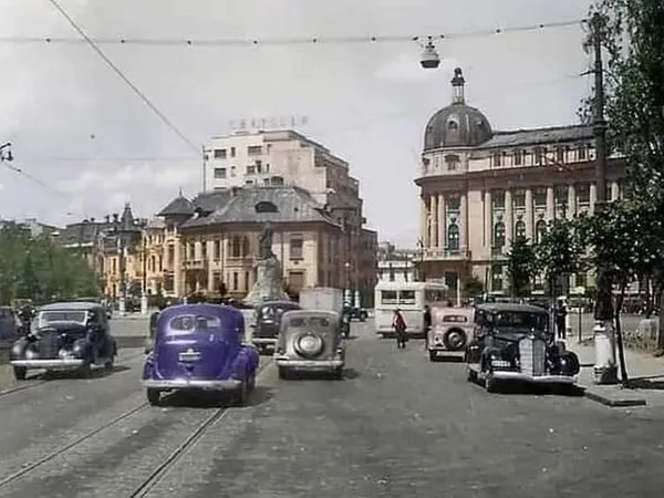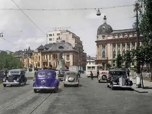 București, anul 1943, actuala intersecție de la Piața Romană. Pe fundal se vede clădirea Academiei de Studii Economice (ASE), iar pe actualele bulevarde Gheorghe Magheru și Lascăr Catargiu se observă că era linie de tramvai.
