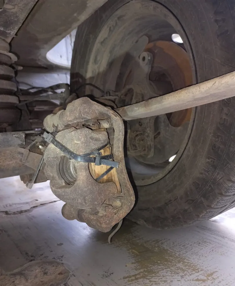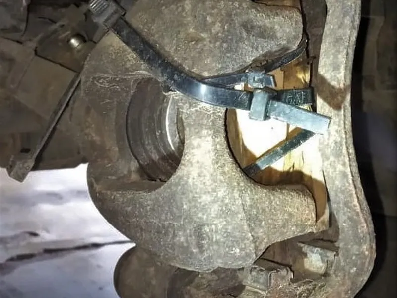Să vă explicăm ce vedeți în fotografii: un etrier demontat de pe fuzetă și prins cu “șoricei” de plastic pe puntea spate, cu pistonul blocat cu o bucată de lemn pentru a nu ieși complet din locașul lui și a duce la pierderea lichidului de frână. Eficiența la frânare a roții respective? Zero... Viața conducătorului auto? Pusă serios în pericol...