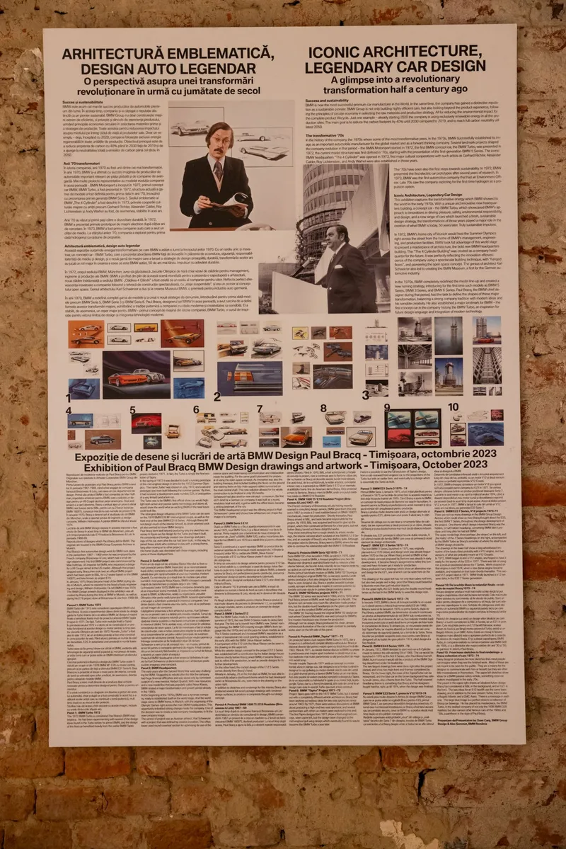 Modelele și schițele de design semnate de Paul Bracq expuse în cadrul expoziției „Arhitectură emblematică, design auto legendar” de la Timișoara sunt prezentate pe 9 panouri.