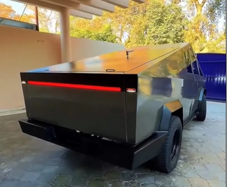Cybertruck-ul lui Wali Muhammad arată ca originalul redus la scară, are faruri cu LED, anvelope off-road și ... motor termic, vehiculul fiind dezvoltat pe platforma tehnică a unei camionete clasice vechi.