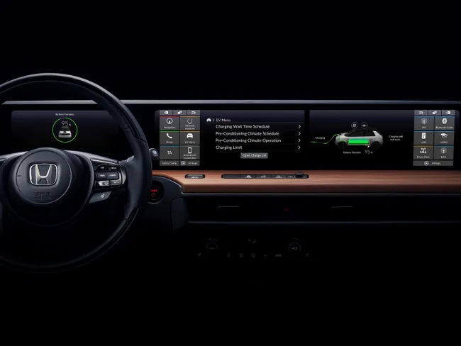 Cele trei display-uri centrale prezintă informațiile utile șoferului, cele furnizate de sistemul de infotainment și de baterie, iar celelalte două, de pe laterale, înlocuiesc oglinzile retrovizoare exterioare. În partea inferioară, însă, în continuare, sistemul de climatizare dispune de butoane.