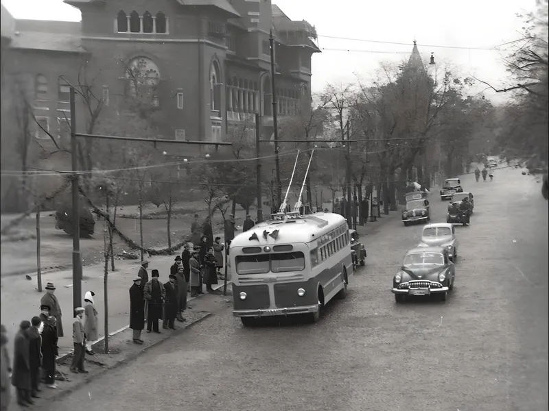 Primul troleibuz din București circula pe Kiseleff acum 75 de ani. Linia STB făcea legătura între Piața Victoriei și Hipodrom, astăzi Piața Presei Libere, troleibuzele erau model MTB-82D, „Made in URSS”. În imagine e stația de la Muzeul Țăranului (fostul Muzeu PCR).
