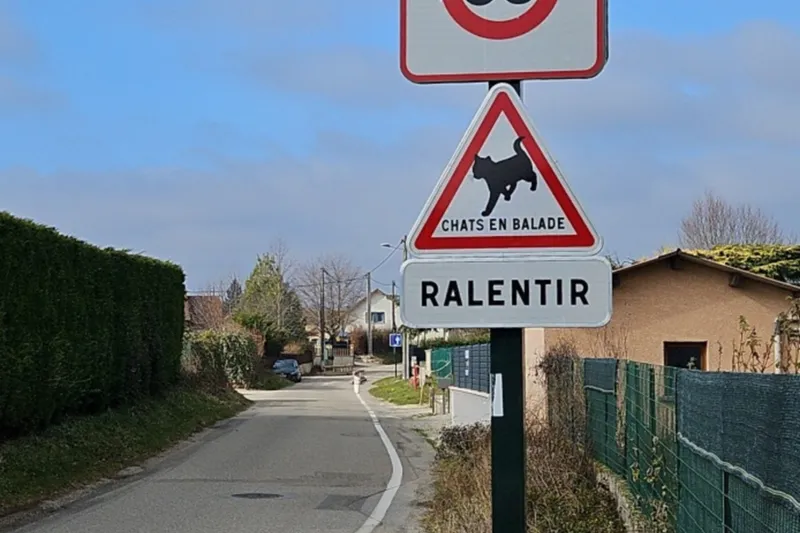 „Atenție, pisică la plimbare! Încetinește!”. În comuna Saint-André-le-Gaz, departamentul Isère din sud-estul Franței, șoferii au descoperit recent cinci noi indicatoare rutiere neobișnuite.