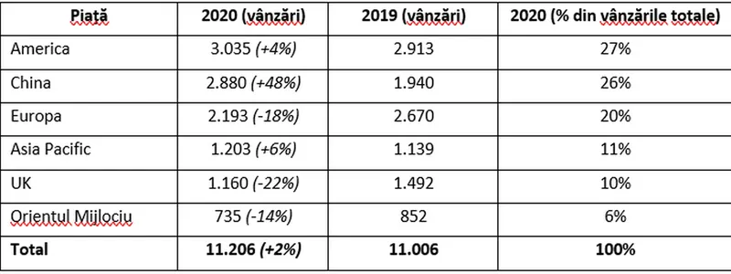 În cele din urmă, regiunea Asia Pacific a înregistrat o creștere de șase procente, livrând 1.203 de mașini, față de 1.139 vândute în 2019.