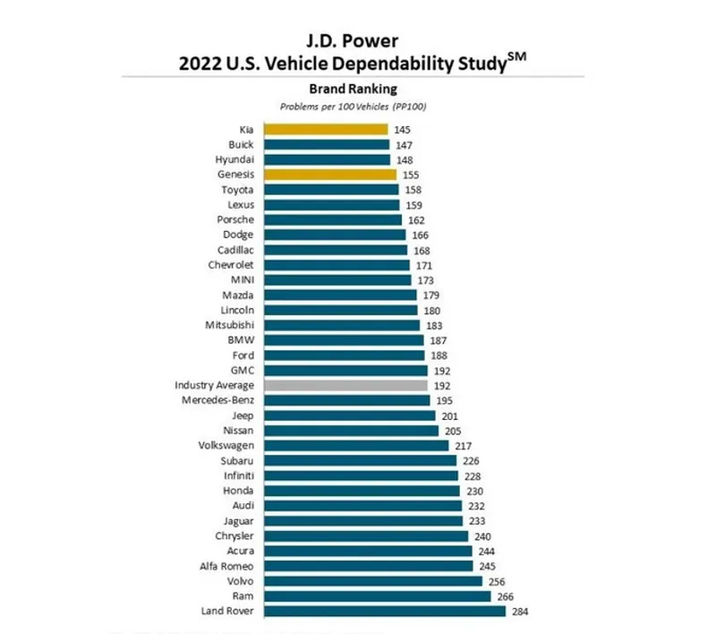 Pentru prima dată în istoria J.D. Power, Kia, o marcă non-premium, a fost desemnată câștigătoare generală în 2022, urcând două poziții în top față de 2021. Mai mult, Kia – Genesis – Hyundai au câștigat trei din cele patru clasamente generale în top-ul J.D Power 2022, realizat după noi criterii.