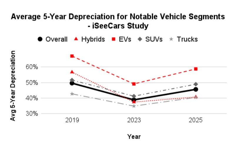Cifrele unui studiu iSeeCars, în cadrul căruia a fost analizată evoluția prețurilor a peste 800.000 de automobile cu o vechime de 5 ani vândute în Statele Unite în perioada martie 2024 - februarie 2025, arată că mașinile electrice se devalorizează în medie cu 58,8%, mult mai mult decât cele care au motor termic. Modelele hybrid, de exemplu, pierd cel mult 40%.