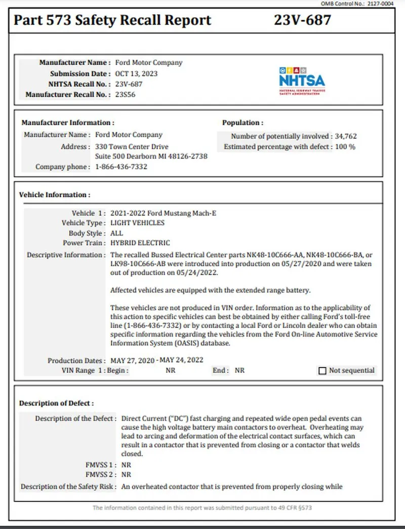 Update-ul a fost conceput să monitorizeze temperatura piesei afectate și să reducă puterea bateriei pentru a evita supraîncălzirea, dar operațiunea nu a rezolvat defectul. Proprietarii de Mustang Mach-E „Long Range” au raportat în continuare probleme, declanșând o investigație federală în SUA cu privire la eficacitatea remedierii.