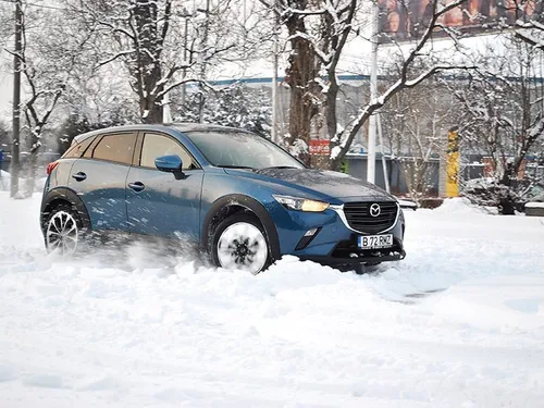 Concret, acesta variază cuplul motor pentru a optimiza încărcarea pe fiecare roată. Și se simte. Dacă nu alunecă pe jos, CX-3-ul se aruncă cu tupeu pe viraje, scrâșnește, începe să țopăie puțin de spate, dar nu deviază decât târziu, chiar și cu electronica decuplată.