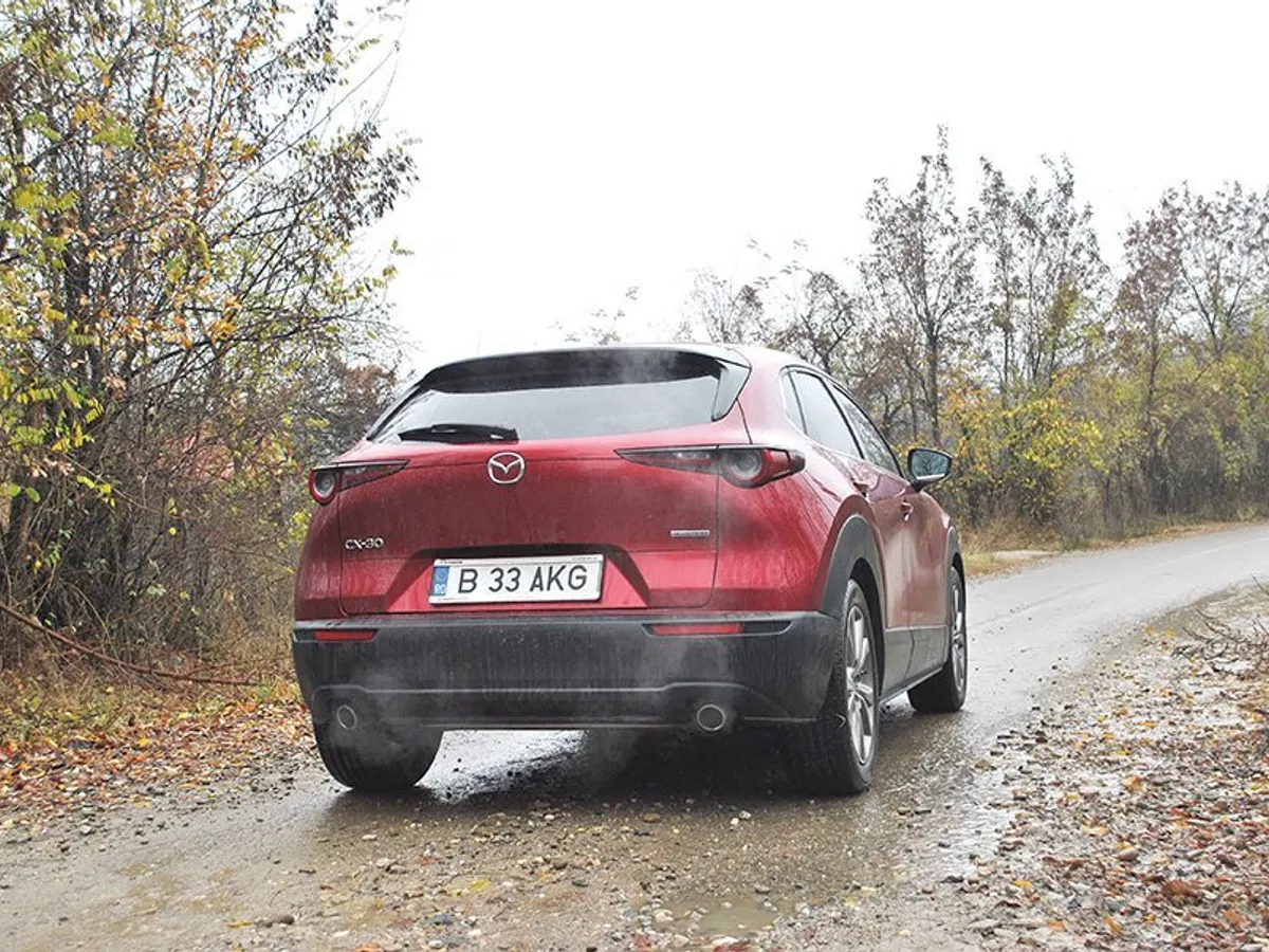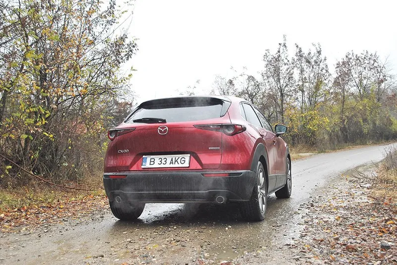 Suspensia SUV-ului CX-30 este mai sportivă decât la alte modele din segment, dar, chiar dacă zdruncină puțin, nu face nazuri pe macadam sau pe drumuri de pământ și este silențioasă.