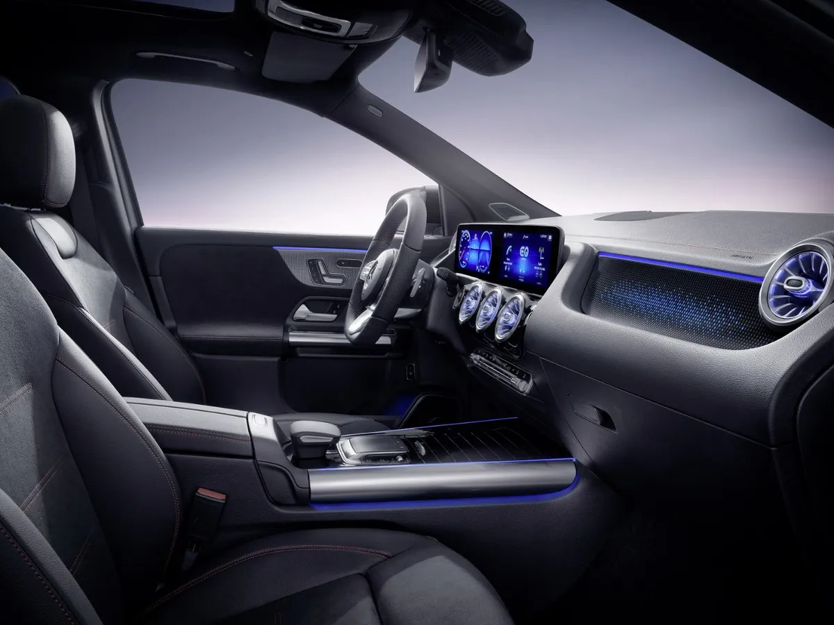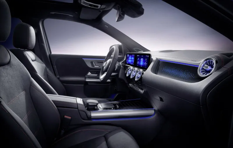 În funcție de pachetul de echipare și design, un alt indiciu al caracterului electric din interiorul EQA-ului sunt elementele decorative iluminate din spate – o premieră pentru Mercedes-Benz, și cele rosé gold de pe gurile de ventilație, scaune și de pe cheia autovehiculului.