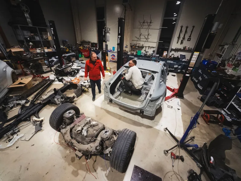 Au fost scoase interiorul, roțile, motoarele, bateria de înaltă tensiune, etc. Se va monta un roll-cage omologat și, apoi, la reasamblare, nu se vor mai monta la loc decât elementele strict necesare, pentru a se reduce cât mai mult posibil greutatea mașinii.