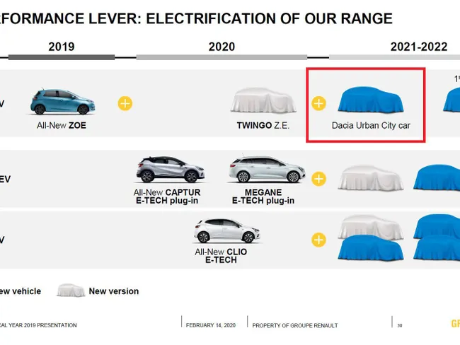 Primul model Dacia 100% electric nu are deocamdată un nume. Apare ca ”Dacia Urban City car” într-un slide și este programat să vadă lumina zilei în prima perioadă a intervalului 2021-2022, după lansarea Renault-ului Twingo ZE în 2020 și înaintea primului model electric pe platforma CMF-EV Renault (2022).