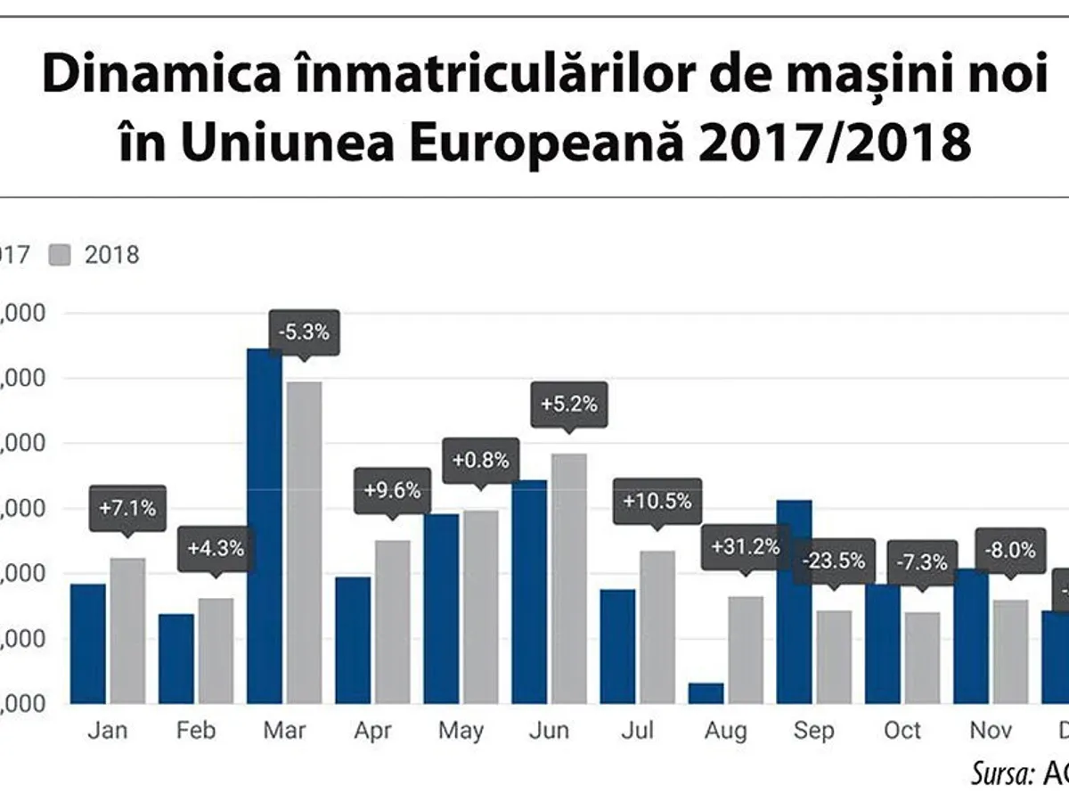 În septembrie, piața a căzut cu 23,5%, în octombrie cu 7,3%, în noiembrie cu 8% și în decembrie cu 8,4%. Iar la final, piața auto europeană a încheiat 2018 cu un avans de 0,1%.