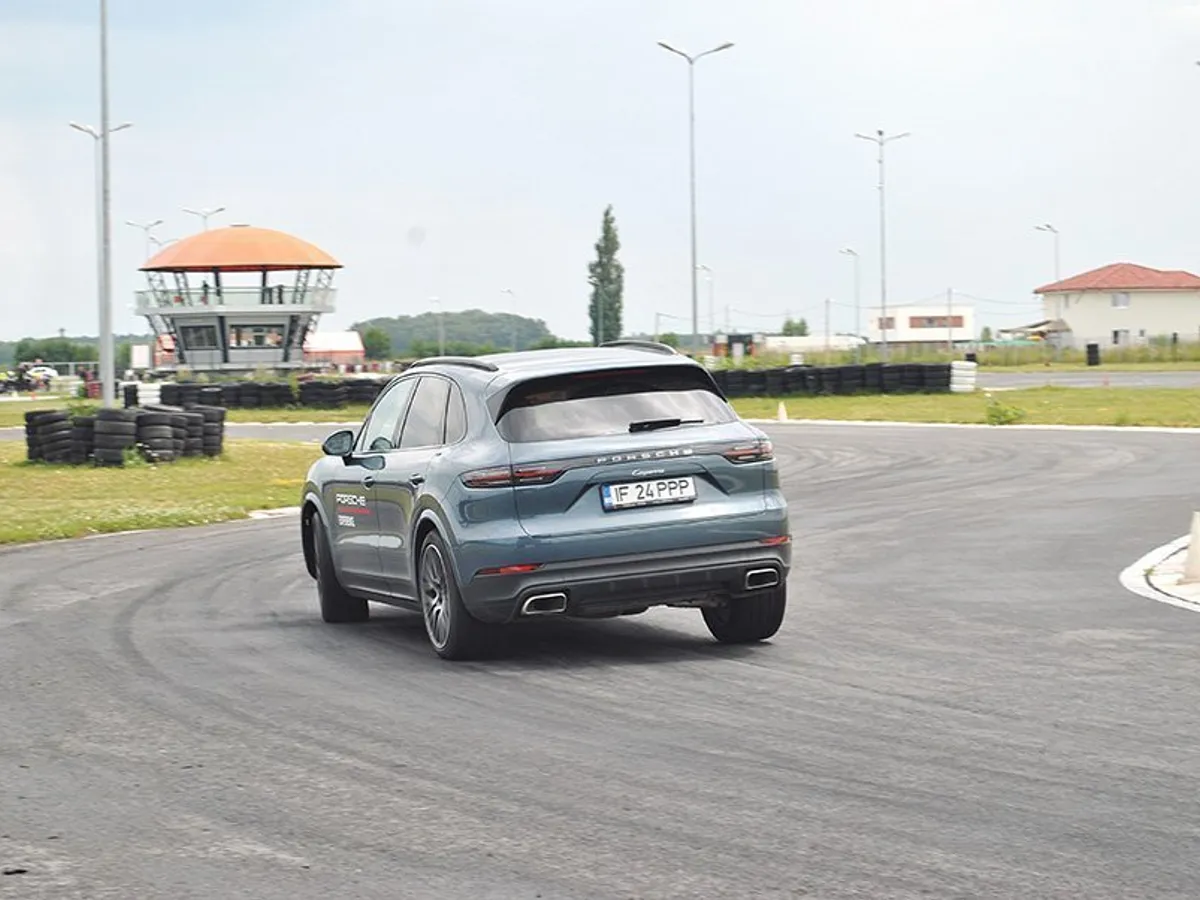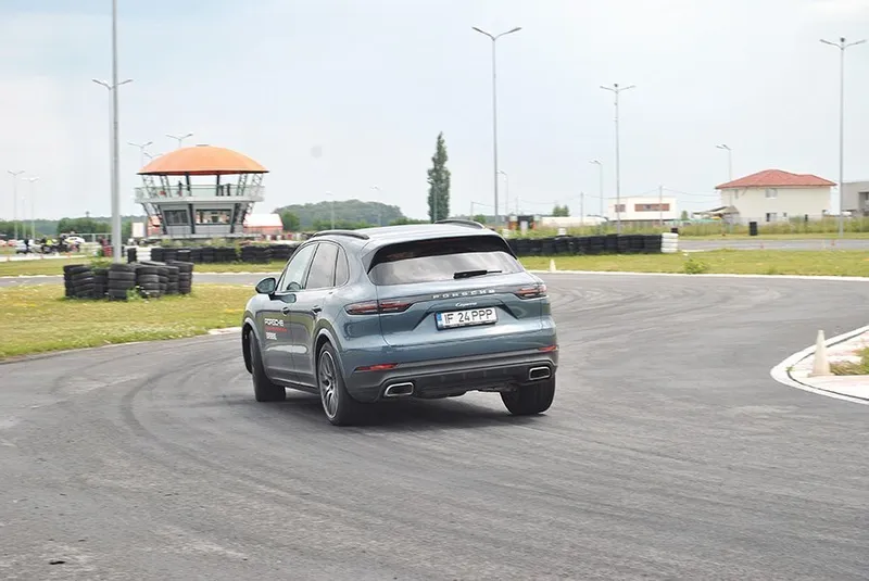 Nu e 911, nici Cayman sau Boxter. Gabaritul, greutatea și garda la sol se simt pe circuit, dar, cu toate acestea, Cayenne arată că este un Porsche și se joacă agil cu virajele abordate ciupind vibratoarele.
