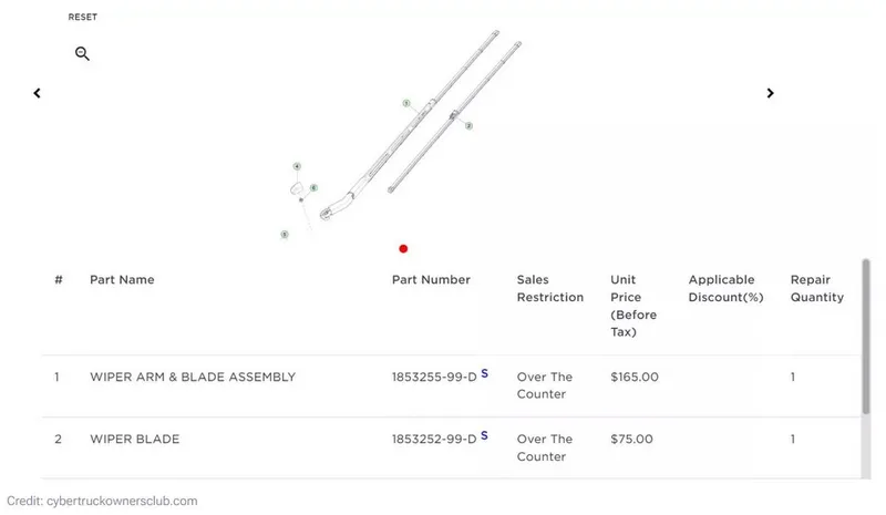 După cum reiese dintr-o serie de capturi de ecran postate de un utilizator de pe Cybertruckowenrsclub (deoarece catalogul de piese de schimb de pe site-ul Tesla nu afișează în prezent prețurile), costul de înlocuire a unei lame de ștergător de parbriz și a unui braț de ștergător pentru Tesla Cybertruck este de 165 $.