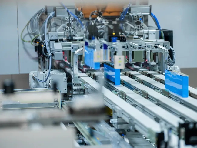 Producţia de baterii de înaltă tensiune poate fi împărţită în două etape: modulele de baterii sunt produse într-un proces extrem de automatizat. Celulele litiu-ion sunt supuse mai întâi unei curăţări cu plasmă, înainte ca un sistem special dezvoltat să acopere celulele pentru a asigura o izolaţie optimă („coating”).