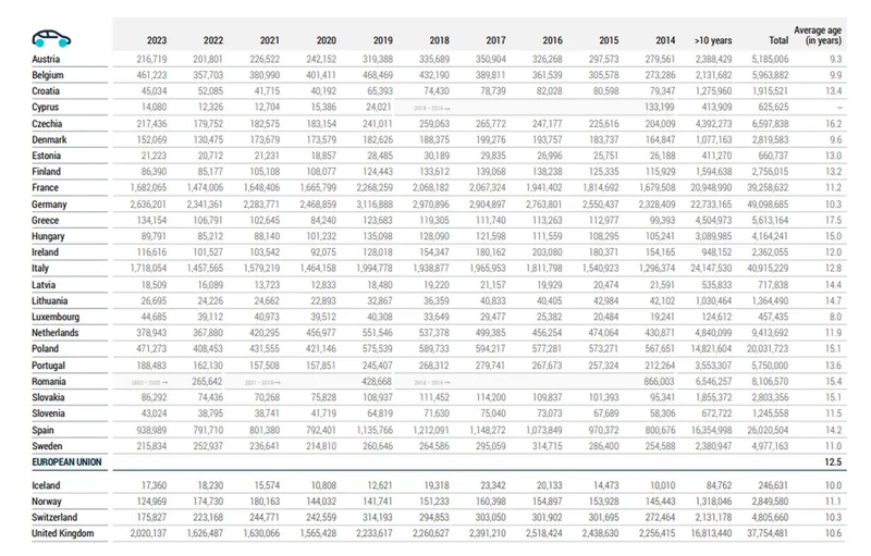 Media de vârstă a parcurilor auto urcă accelerat peste tot. Dacă în 2021 vechimea medie a mașinilor din UE era de 12 ani, în 2023 a urcat la 12,3 ani, iar în 2024 a ajuns la 12,5 ani.