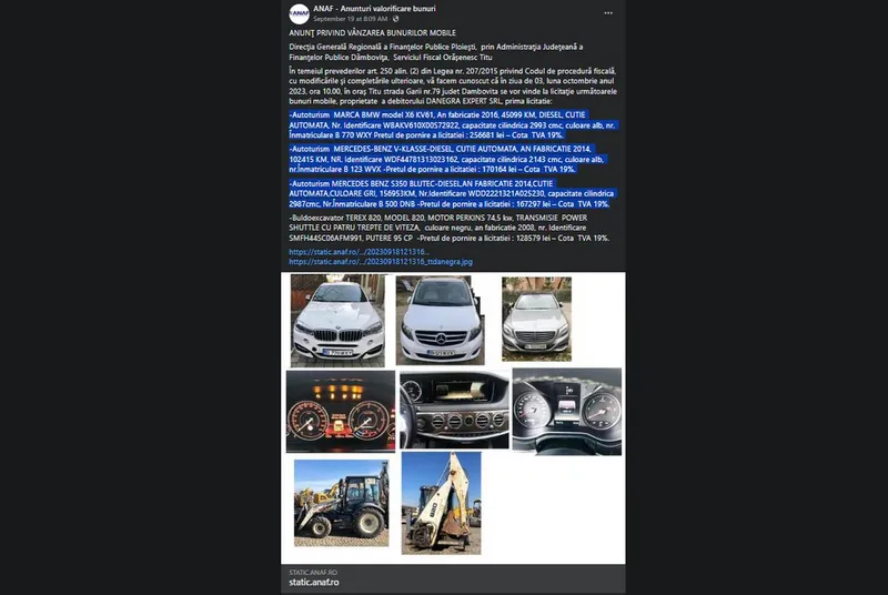 Direcţia Generală Regională a Finanţelor Publice Ploieşti, prin Administraţia Judeţeană a Finanţelor Publice Dâmboviţa, Serviciul Fiscal Orășenesc Titu, a publicat un anunț de licitație pentru trei autovehicule, proprietate a debitorului DANEGRA EXPERT SRL, în ziua de 3 octombrie 2023, ora 10.00, în orașul Titu, județul Dâmbovița, în temeiul prevederilor art. 250 alin. (2) din Legea nr. 207/2015 privind Codul de procedură fiscală, cu modificările şi completările ulterioare.