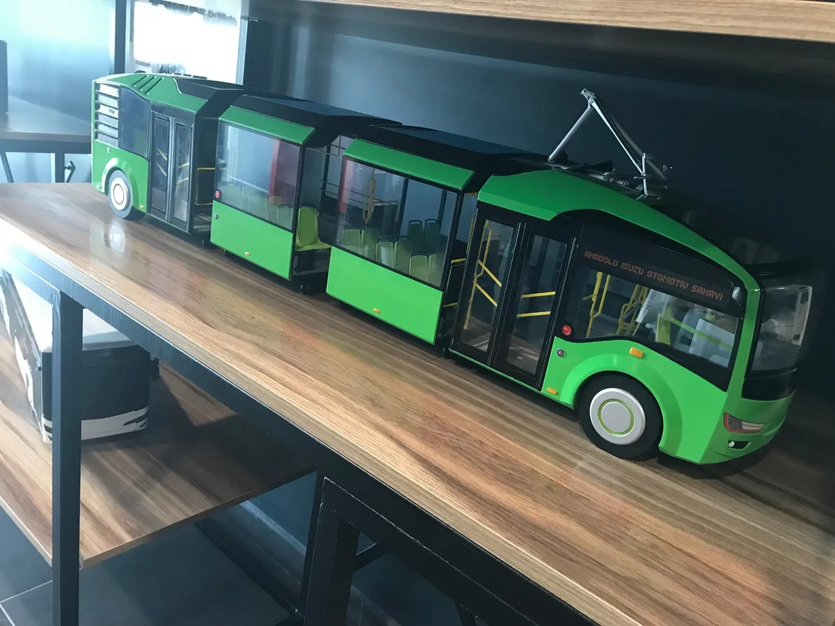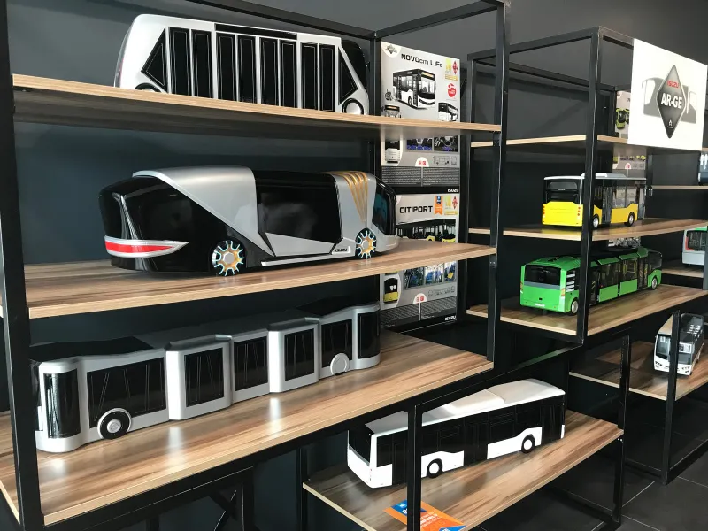 Când am intrat în centrul R&D de la etajul întâi al clădirii administrative a facilității din Kocaeli, am fost rugați să nu fotografiem decât în zonele în care ni se va comunica punctual că avem voie. Cum industria auto se află în plin proces de schimbare datorită electrificării, specialiștii Anadolu Isuzu lucrează deja la sisteme diesel-hibride și la dezvoltarea de autobuze 100% electrice, precum și la schițarea autobuzelor viitorului. Cum arată acestea în viziunea Anadolu Isuzu vedeți în schițele de mai jos.