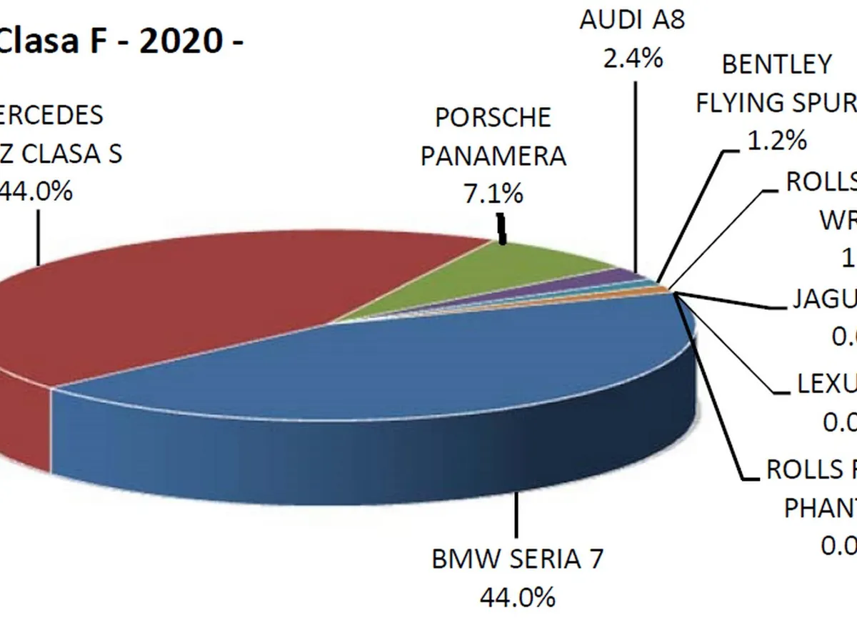Top-ul preferințelor în segmentul ”F” din primele 7 luni ale anului 2020, unde tarifele de bază pornesc de la peste 95.000 de euro, TVA inclusă, este condus de BMW Seria 7 și Mercedes-Benz S Klasse, cu 37 de unități fiecare. Urmează Porsche Panamera (6 unități) și Audi A8 (2 unități).
