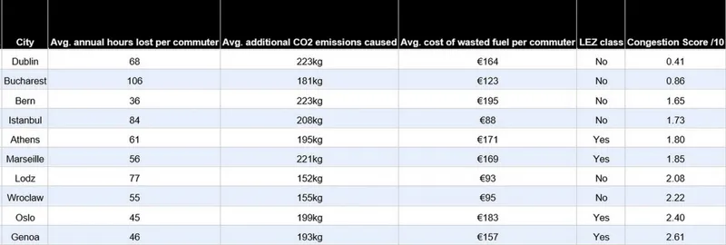 Orașul cu cel mai de coșmar trafic din Europa este Dublin, potrivit datelor Moneybarn. Șoferii din capitala Irlandei petrec, în medie, 68 de ore pe an blocați în trafic, irosind 164 de euro pe combustibil și producând 223 kg de CO2 suplimentar.