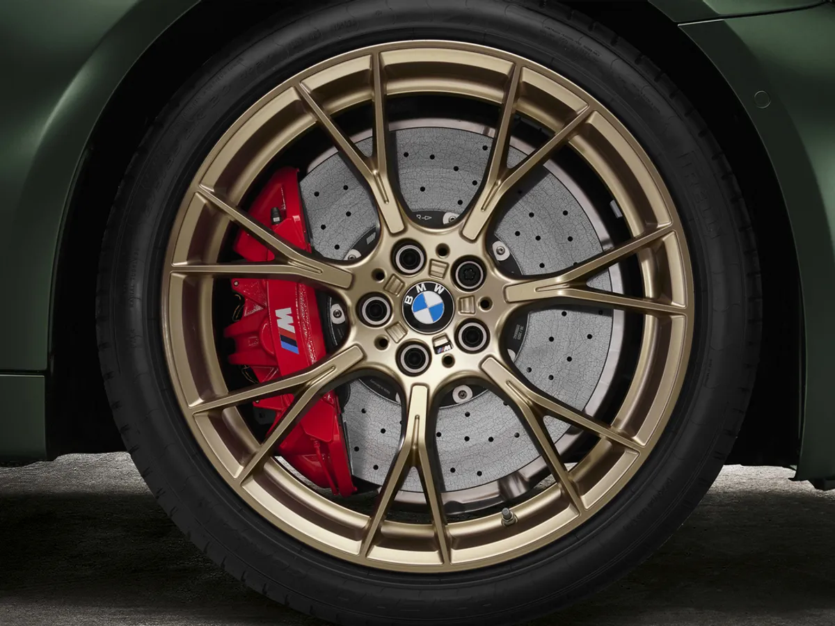 Frânele M din carbon ceramic pentru BMW M5 CS oferă o forţă de oprire impresionantă. Etriere fixe cu şase pistoane pe puntea faţă şi etrierele flotante cu un singur piston pe puntea spate poartă logo-ul M şi sunt vopsite standard în roşu, opţional fiind disponibilă şi o finisare aurie.