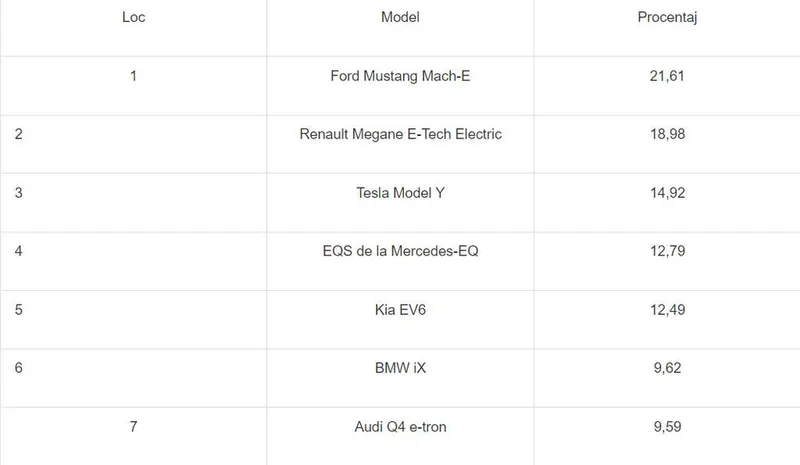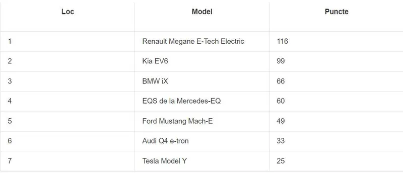 Șapte dintre ele au intrat în finală: Audi Q4 e-tron/Q4 Sportback e-tron, BMW iX, Ford Mustang Mach-E, Kia EV6, EQS de la Mercedes-EQ, Renault Megane E-Tech Electric și Tesla Model Y.