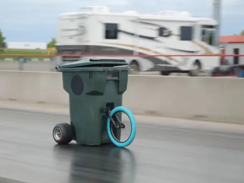 Recordul de viteză cu tomberonul de gunoi a fost înregistrat pe un circuit special de „Drag Race”. Și nu a fost lipsit de peripeții.