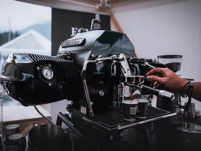 Transformarea motorului motocicletei R18 într-o mașină de espresso este și un tribut adus culturii café racer... fără a fi una.
