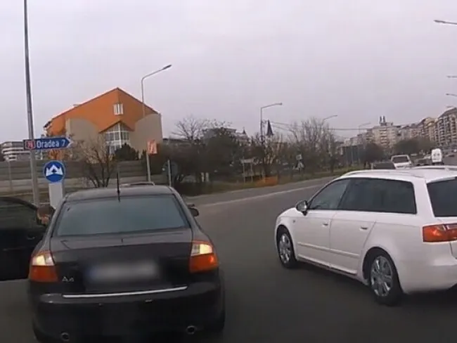 Un șofer bihorean a avut parte de o surpriză neplăcută pe centura municipiului Oradea. Bărbatul, aflat la volanului unui Seat de culoare albă, a înconjurat giratoriul pe banda exterioară și a tăiat calea unui Audi care a virat dreapta de pe banda doi pentru a ieși din intersecție.