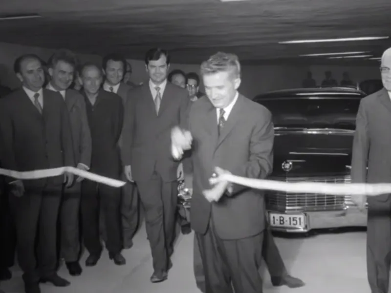 În imaginile de arhivă publicate de Cineclic.ro, fostul dictator este surprins în momentul în care, în aplauzele mai multor tovarăși, taie panglica Parcării de la Intercontinental. Interesant, Ceaușescu a venit eveniment la bordul unui limuzine Cadillac Fleetwood 75, care nu prea apare în multe filmări.