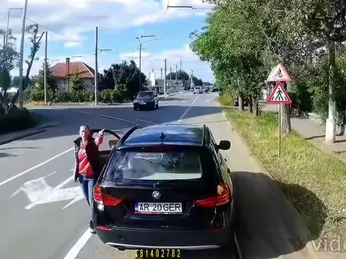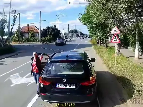 Vatmanul s-a apropiat de BMW și a claxonat din nou. Iar șoferița n-a mai rezistat. S-a dat jos din mașină și, vizibil enervată, a început să gesticuleze, să-l certe pe conducătorul tramvaiului că nu a lăsat-o să staționeze unde voia ea.