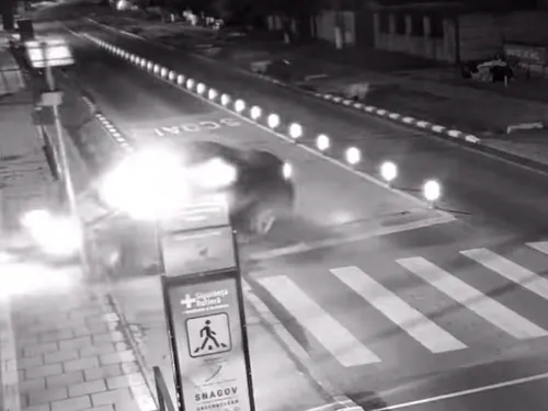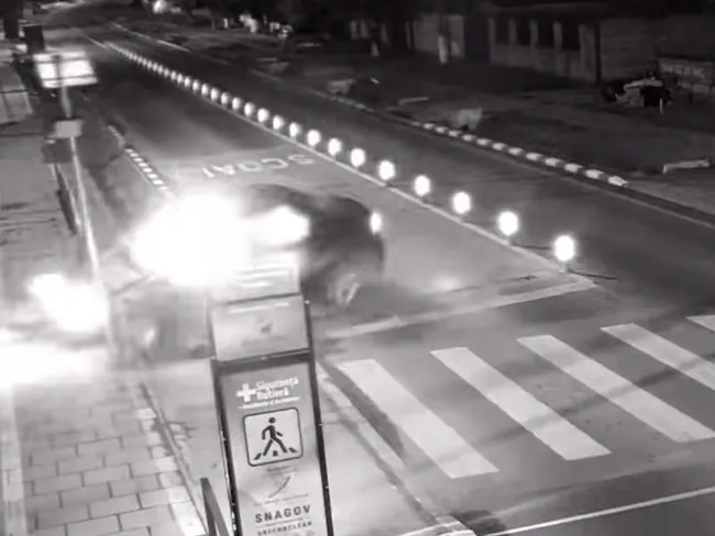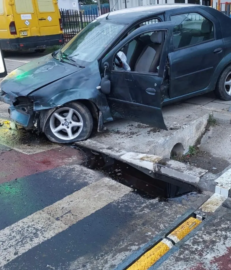 Dar mașina se dezechilibrează la frână, derapează necontrolat și „mătură” de-a latul drumul pe o distanță de circa 30-40 de metri, oprindu-se chiar pe trecere și trotuar. A rupt și stâlpul metalic cu semnul de „Trecere pietoni”.