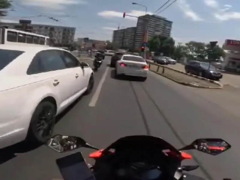 Imagini cu un motociclist care „croșetează” mașinile la semafor și se înfige într-una, nereușind să se mai strecoare, au devenit virale pe rețelele de socializare. Dacă ar fi analizate de poliție în baza noului Cod Rutier, „pilotul” ar putea fi sancționat drastic.