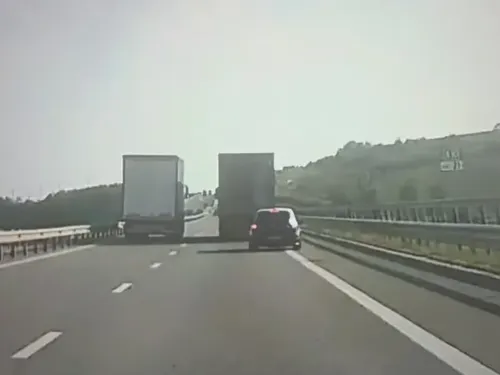 VIDEO Un șofer a fost surprins depășind 2 camioane pe banda de urgență. Ce amendă riscă? Imaginile surprinse de un alt participant la trafic evidențiază faptul că autoturismul a reușit să treacă la limită pe lângă unul dintre autocamioane.