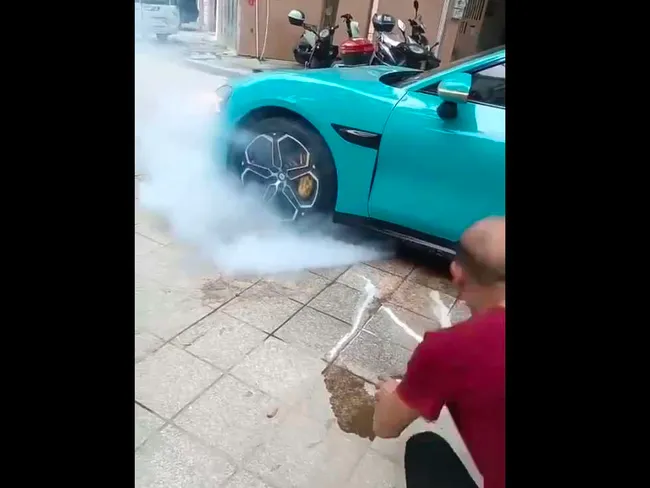 În filmuleț se vede cum șoferul încearcă să intervină cu un extinctor, dar fără succes. Fum gros țâșnește de sub mașină și se aude un fâsâit puternic.