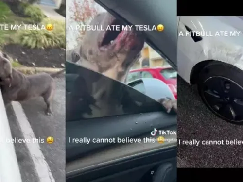 VIDEO VIRAL Un pitbull mănâncă o mașină electrică Tesla Model 3. La propriu!
