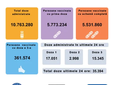 Un număr de 35.394 de doze de vaccin Pfizer, Moderna, AstraZeneca şi Johnson&Johnson au fost administrate în ultimele 24 de ore, dintre care 17.051 reprezintă prima doză, 2.998 - doza a doua şi 15.345 - doza a treia, a informat, duminică, CNCAV.