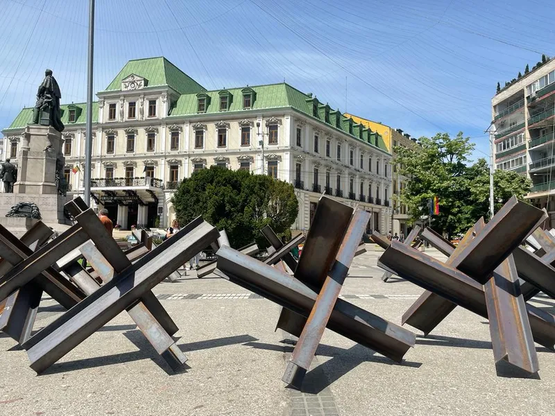 Baraje anti-tanc folosite în războiul din Ucraina, montate în Piața Unirii din Iași