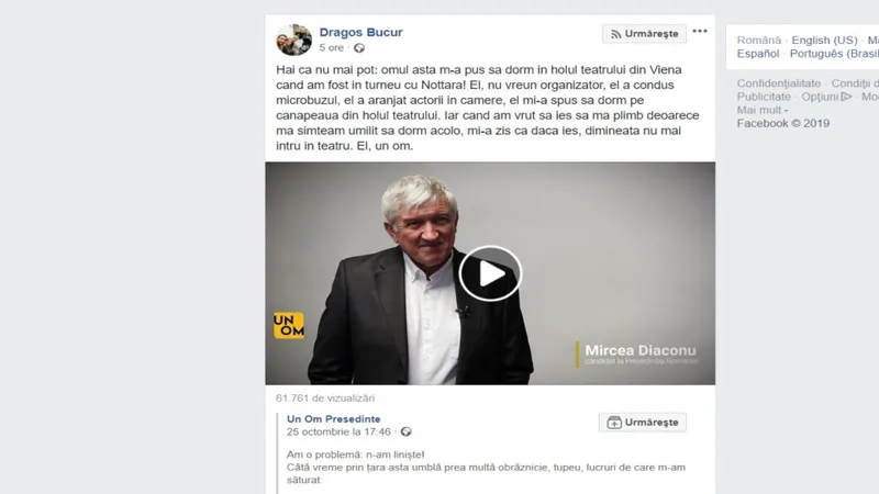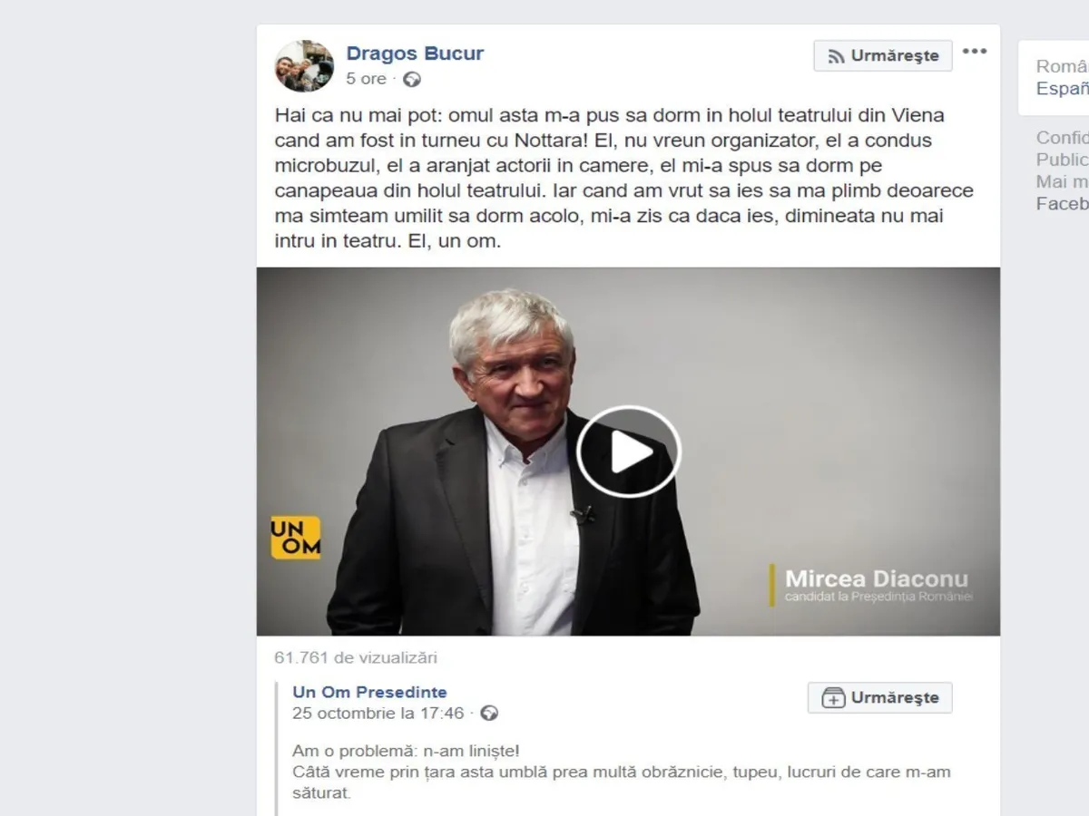 „Hai ca nu mai pot: omul asta m-a pus sa dorm in holul teatrului din Viena cand am fost in turneu cu Nottara! El, nu vreun organizator, el a condus microbuzul, el a aranjat actorii in camere, el mi-a spus sa dorm pe canapeaua din holul teatrului. Iar cand am vrut sa ies sa ma plimb deoarece ma simteam umilit sa dorm acolo, mi-a zis ca daca ies, dimineata nu mai intru in teatru. El, un om”, a scris Dragoș Bucur pe pagina sa de Facebook.
