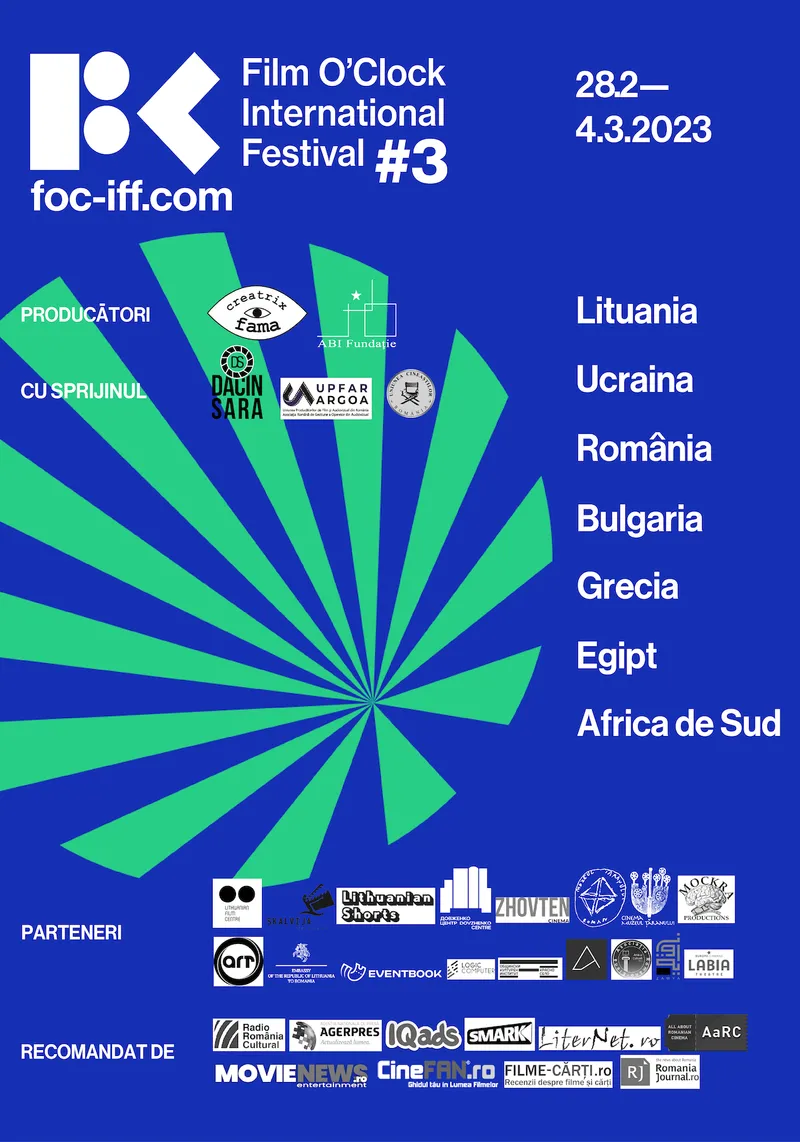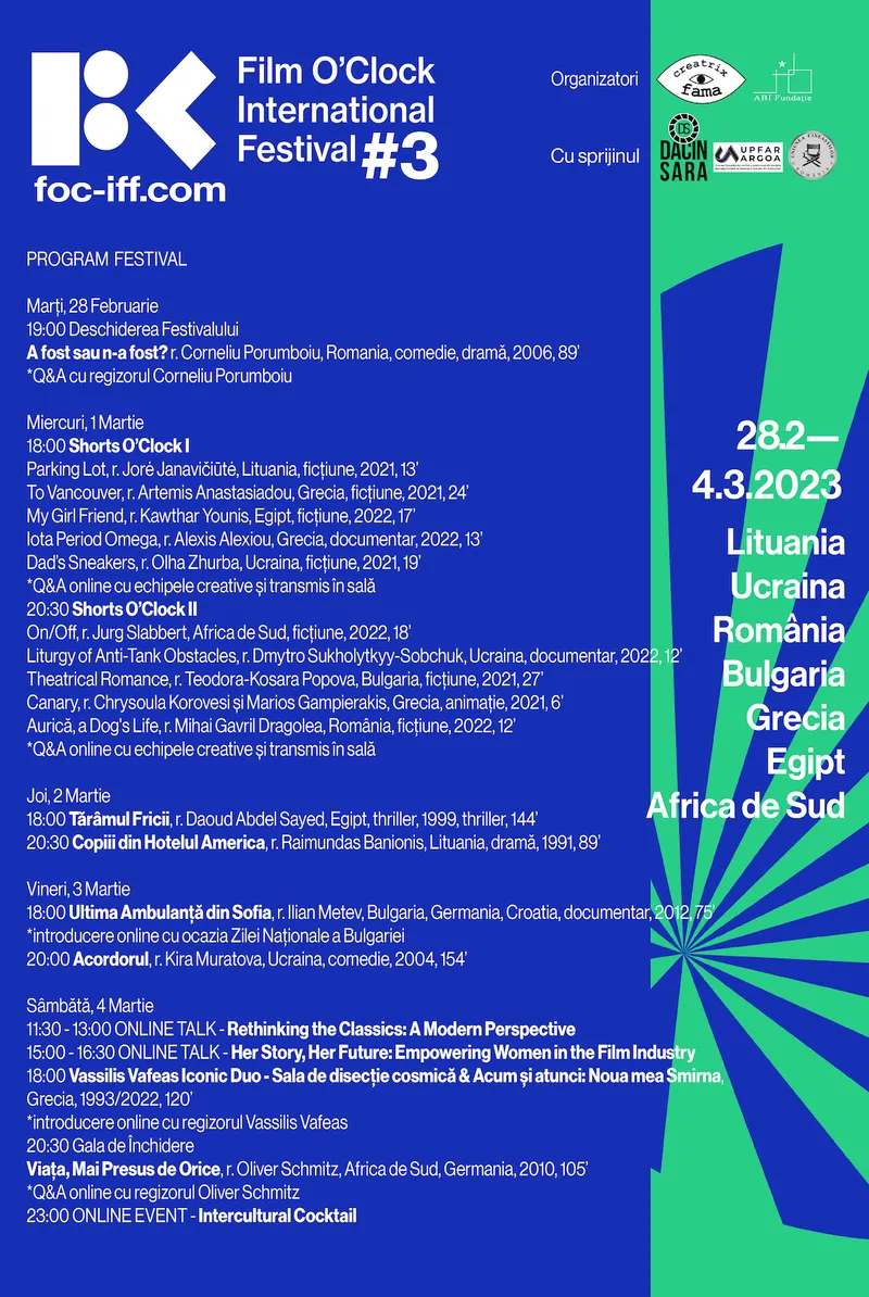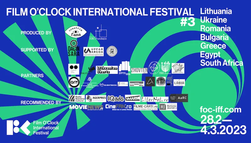 Creatrix Fama și ABI Fundație, cu sprijinul DACIN SARA, al UPFAR ARGOA, și al UCIN, organizează cea de-a treia ediție a Film O’Clock International Festival, în perioada 28 februarie - 4 martie 2023, cu proiecții simultane în 7 cinematografe din 7 țări: Cinema Muzeul Țăranului (București, România), Skalvija Cinema (Vilnius, Lituania), Cinema Zhovten (Kiev, Ucraina), Centrul Cultural Krasno Selo (Sofia, Bulgaria), Cinema Andora (Atena, Grecia), Zawya Cinema (Cairo, Egipt) și Labia Theatre (Cape Town, Africa de Sud), dar și cu dezbateri și discuții online.