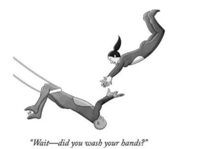 Umorul rezidă în comentariul final: „Este un cadou”, a spus bărbatul. „Pot să strănut când vreau”. Așa cum apare în acest desen animat, distanțarea socială își are originea în frica de germeni, scriu cele două cercetătoare din Brașov.