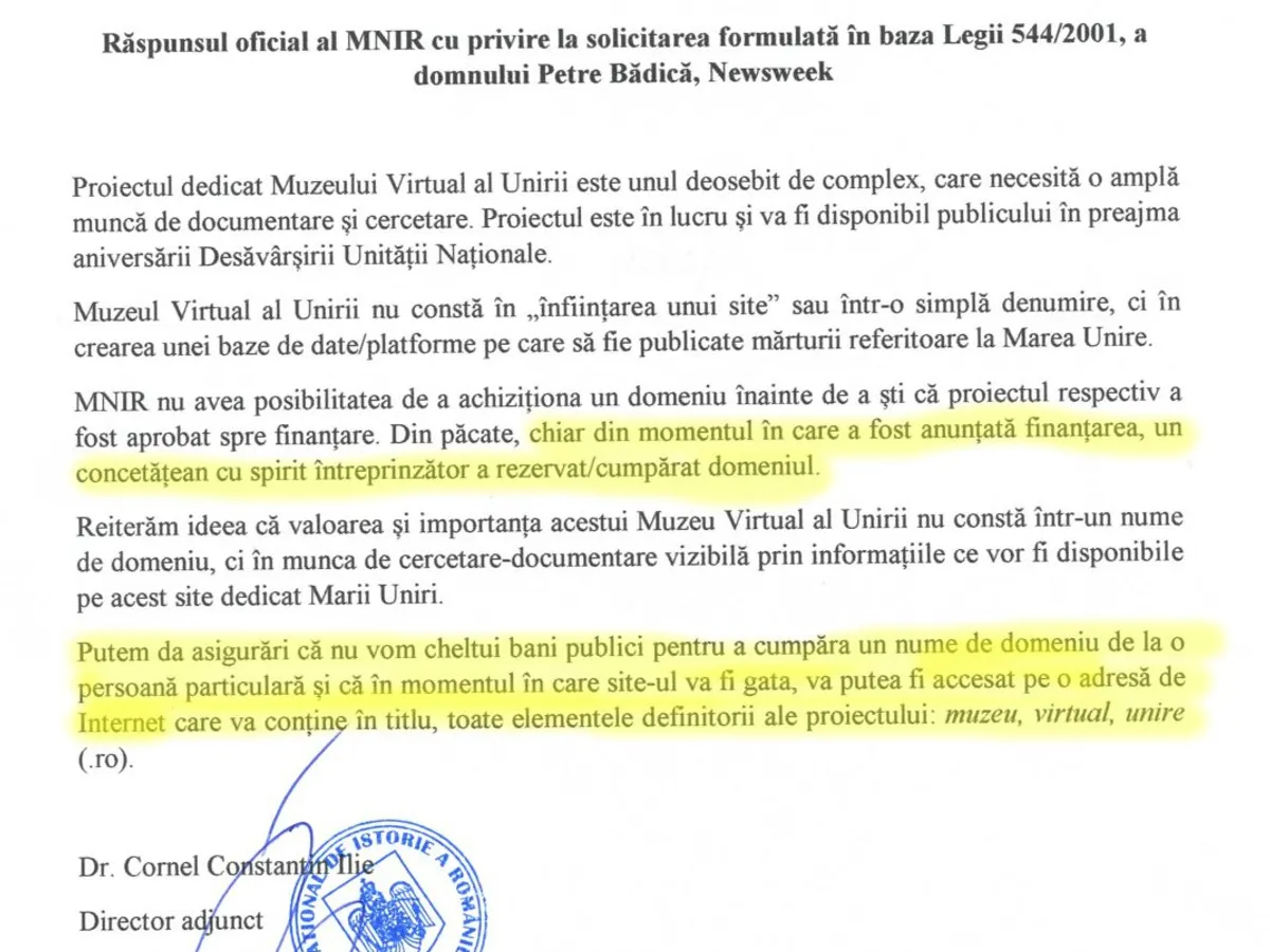 Reiterăm ideea că valoarea și importanța acestui Muzeu Virtual al Unirii nu constă într-un nume de domeniu, ci în munca de cercetare-documentare vizibilă prin informațiile ce vor fi disponibile pe acest site dedicat Marii Unirii. Putem da asigurări că nu vom cheltui bani publici pentru a nu cumpăra un nume de domeniu de la o persoană particulară și că în momentul în care site-ul va fi gata, va putea fi accesat pe o adresă de Internet care va conține, în titlu, toate elementele definitorii ale proiectului: muzeu, virtual, unire (.ro)”. Semnmat Cornel Constantin Ilie, Director adjunct al Muzeului de Istorie.