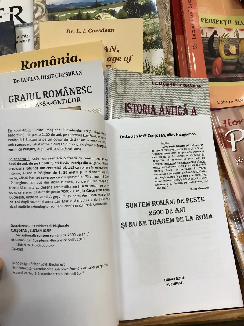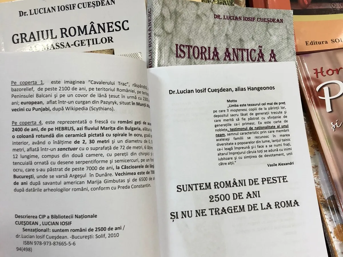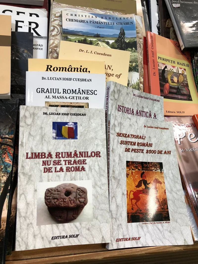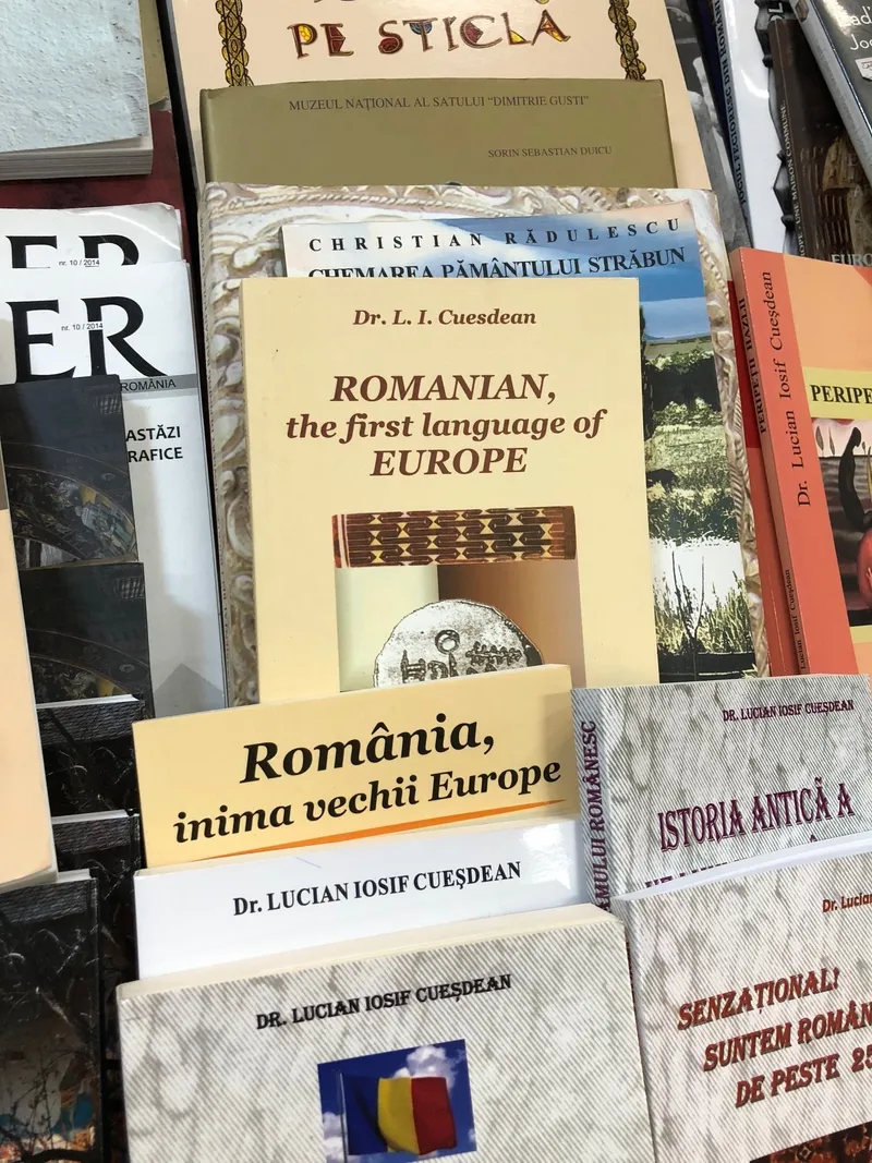 În buticul de suveniruri al Muzeului Satului din București, se lăfăie la vedere, în centrul raftului cu cărți de vânzare, câteva titluri aberante. Cum ar fi: "Limba rumânilor nu se trage de la Roma", "Graiul românesc al massa-geților" sau "Romanian, the first language of Europe".